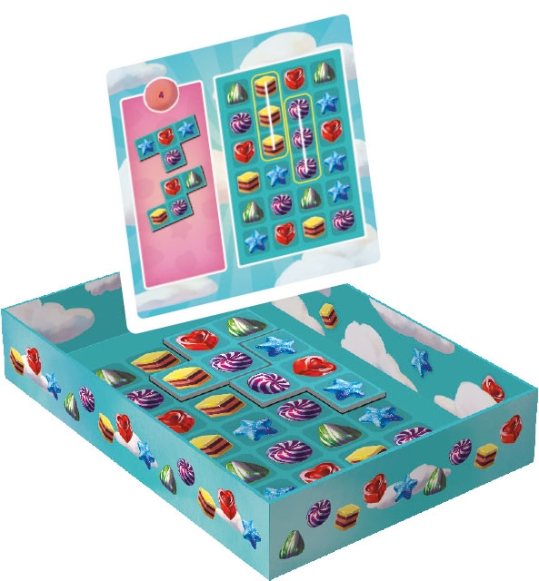 Candies (Gamme Logic de Bankiiiz Éditions) reprend le principe des célèbres jeux vidéo de “match-3”, où il faut réussir à aligner des symboles identiques au sein d’une grille. En plaçant le ou les polyominos indiqués sur la carte Défi, il faut parvenir à modifier l’aire de jeu au fond de la boîte pour récréer les lignes de bonbon imposées. Il faudra donc faire preuve de logique et de projection dans l’espace pour placer chaque tuile au bon endroit. Les 60 cartes Défi fournissent les indices nécessaires pour trouver la seule solution possible. Classées par ordre croissant de difficulté, elles permettent une vraie progression des stratégies intellectuelles à mettre en place.